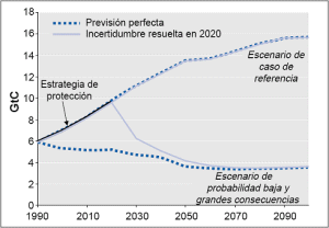 La Figura RT-10a muestra los resultados de un análisis de rentabilidad en que se explora la estrategia óptima de protección cuando no se haya resuelto la incertidumbre con respecto a la meta de estabilización a largo plazo antes de 2020, sugiriendo que la reducción de emisiones en los próximos años sería económicamente valiosa si existiese una probabilidad importante de tener que permanecer por debajo de topes que se habrían alcanzado de otro modo dentro de las escalas temporales características de los sistemas que producen gases de efecto invernadero. El grado de protección a corto plazo en el análisis anterior es sensible a la fecha de resolución de la incertidumbre, la inercia en el sistema energético y el hecho de que deba satisfacerse a toda costa el objetivo definitivo de concentración (una vez que haya sido revelado). Otros experimentos, como aquellos con modelos de costo–beneficios estructurados como un problema de análisis de decisión bayesiano, muestran que las trayectorias óptimas de emisión a corto plazo (los próximos dos decenios) sólo divergen modestamente en virtud de una previsión y protección perfectas, incluso para escenarios de probabilidad baja y gran consecuencia (véase la Figura RT.10b). Sin embargo, quizás tengan que adoptarse decisiones acerca de políticas climáticas a corto plazo, mientras todavía se está debatiendo el objetivo de estabilización. Por lo tanto, la toma de decisiones debería considerar la protección apropiada contra la resolución futura de esa meta y la posible revisión de las perspectivas científicas acerca de los riesgos del cambio climático. Varios estudios han tratado de identificar la estrategia de protección óptima a corto plazo basada en la incertidumbre en cuanto al objetivo a largo plazo. Esos estudios comprueban que la cantidad deseable de protección depende de la evaluación que se haga de los intereses, las probabilidades y el costo de la mitigación. La prima de riesgo ––la cantidad que la sociedad está dispuesta a pagar para evitar el riesgo–– es en definitiva una decisión política que varía de un país a otro.