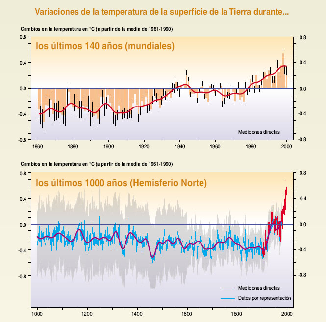 de mediciones directas de la temperatura (1860– 2000, panel superior), aumento