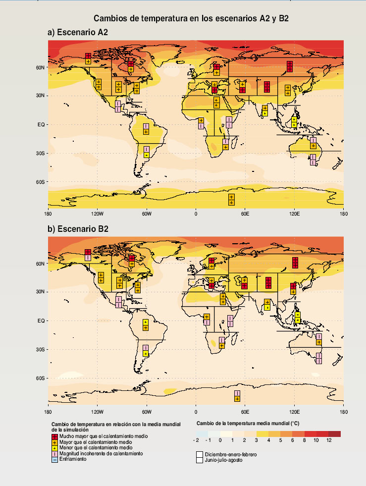 entre 1,2 y 4,5° C para el escenario A2 y entre 0,9 y 3,4° C para el B2 y, por