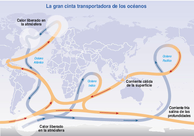 y redistribución del calor (como las corrientes que fluyen hacia el Polo en el