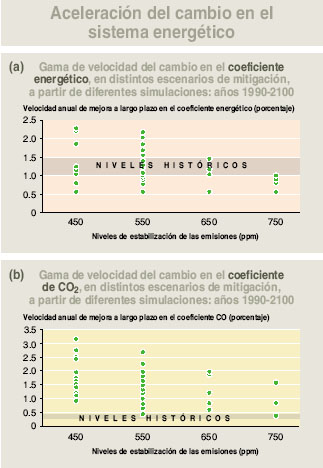 de carbono por unidad de energía) para estabilizar los niveles por debajo de 600