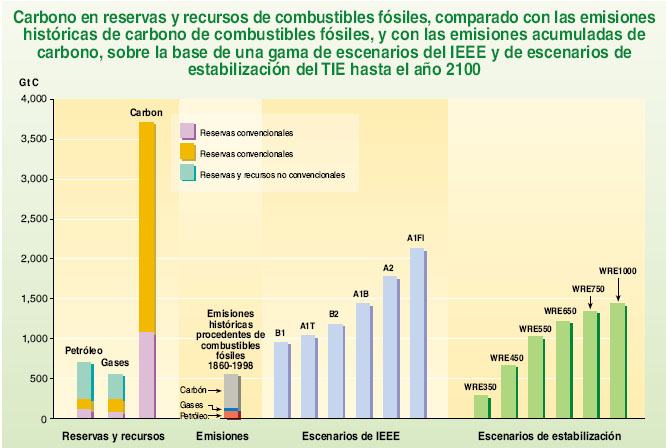 a una cantidad estimada de 2.000 Gt C. Las columnas del escenario muestran los