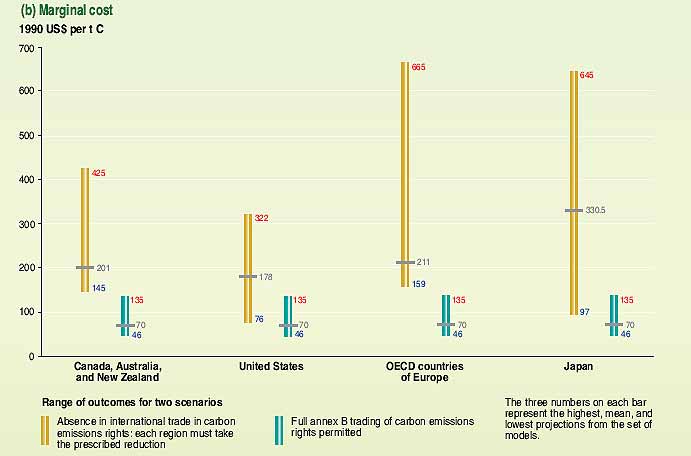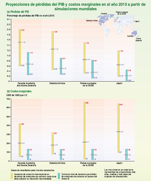 Figura RRP–8: Proyecciones de pérdidas de PIB y costos marginales en países del Anexo II en el año 2010, a partir de simulaciones mundiales: a) pérdidas del PIB y b) costos marginales. Las reducciones en PIB para el año 2010 están relacionadas con el PIB de la simulación de referencia. Estas estimaciones se basan en los resultados de nueve equipos que realizan simulaciones y participaron en el estudio del Energy Modeling Forum. Las proyecciones que muestran las figuras son para las cuatro regiones que forman parte del Anexo II. Las simulaciones examinan dos escenarios. En el primero, cada región lleva a cabo la reducción recomendada únicamente con comercio de derechos de emisiones de carbono en el plano nacional. En el segundo, se permite ese comercio con los países del Anexo B y, por lo tanto, los costos marginales son idénticos en las cuatro regiones. En cada caso o región se muestran los valores máximos, mínimos y medios de los costos marginales estimados en todas las simulaciones. Véanse los factores clave, hipótesis e incertidumbres en los estudios, en el Cuadro 7–3 y el Recuadro 7–1 del TIE.