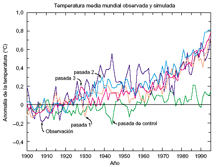 entre 1900 y 1930. Puede verse la simulación de control y las tres simulaciones