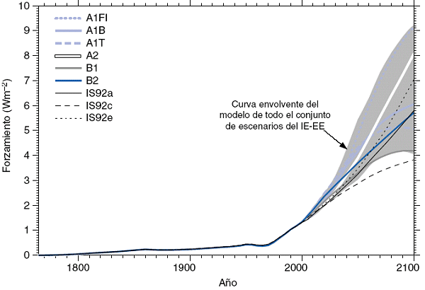 el forzamiento correspondiente a los escenarios IS92a, IS92c y IS92e, calculado