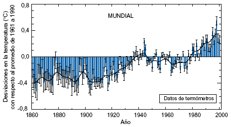 superficie del mar (°C) en el período de 1861 a 2000, en relación con el período
