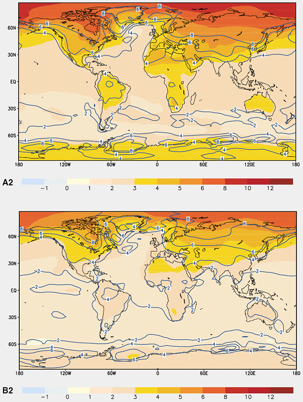 (isolíneas) (Unidad: °C) en el escenario A2 del
