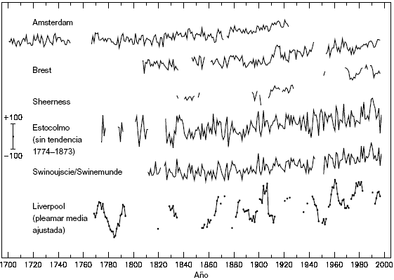 temporal del nivel relativo del mar en los últimos 300 años en Europa septentrional: