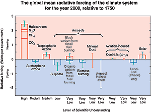 Figure 3: Many external factors force climate change. These radiative forcings arise from changes in the atmospheric composition, alteration of surface reflectance by land use, and variation in the output of the sun. Except for solar variation, some form of human activity is linked to each. The rectangular bars represent estimates of the contributions of these forcings - some of which yield warming, and some cooling. Forcing due to episodic volcanic events, which lead to a negative forcing lasting only for a few years, is not shown. The indirect effect of aerosols shown is their effect on the size and number of cloud droplets. A second indirect effect of aerosols on clouds, namely their effect on cloud lifetime, which would also lead to a negative forcing, is not shown. Effects of aviation on greenhouse gases are included in the individual bars. The vertical line about the rectangular bars indicates a range of estimates, guided by the spread in the published values of the forcings and physical understanding. Some of the forcings possess a much greater degree of certainty than others. A vertical line without a rectangular bar denotes a forcing for which no best estimate can be given owing to large uncertainties. The overall level of scientific understanding for each forcing varies considerably, as noted. Some of the radiative forcing agents are well mixed over the globe, such as CO2, thereby perturbing the global heat balance. Others represent perturbations with stronger regional signatures because of their spatial distribution, such as aerosols. For this and other reasons, a simple sum of the positive and negative bars cannot be expected to yield the net effect on the climate system. The simulations of this assessment report (for example, Figure 5) indicate that the estimated net effect of these perturbations is to have warmed the global climate since 1750. [Based upon Chapter 6, Figure 6.6] |