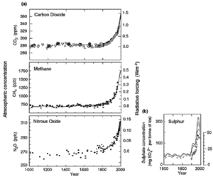 ![]() Figure 8: Records of changes in atmospheric composition. (a) Atmospheric concentrations of CO2, CH4 and N2O over the past 1,000 years. Ice core and firn data for several sites in Antarctica and Greenland (shown by different symbols) are supplemented with the data from direct atmospheric samples over the past few decades (shown by the line for CO2 and incorporated in the curve representing the global average of CH4). The estimated radiative forcing from these gases is indicated on the right-hand scale. (b) Sulphate concentration in several Greenland ice cores with the episodic effects of volcanic eruptions removed (lines) and total SO2 emissions from sources in the US and Europe (crosses). [Based on (a) Figure 3.2b (CO2), Figure 4.1a and b (CH4) and Figure 4.2 (N2O) and (b) Figure 5.4a] |