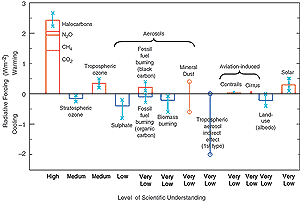 Figure 9: Global, annual-mean radiative forcings (Wm-2) due to a number of agents for the period from pre-industrial (1750) to present (late 1990s; about 2000) (numerical values are also listed in Table 6.11 of Chapter 6). For detailed explanations, see Chapter 6.13. The height of the rectangular bar denotes a central or best estimate value, while its absence denotes no best estimate is possible. The vertical line about the rectangular bar with “x” delimiters indicates an estimate of the uncertainty range, for the most part guided by the spread in the published values of the forcing. A vertical line without a rectangular bar and with “o” delimiters denotes a forcing for which no central estimate can be given owing to large uncertainties. The uncertainty range specified here has no statistical basis and therefore differs from the use of the term elsewhere in this document. A “level of scientific understanding” index is accorded to each forcing, with high, medium, low and very low levels, respectively. This represents the subjective judgement about the reliability of the forcing estimate, involving factors such as the assumptions necessary to evaluate the forcing, the degree of knowledge of the physical/chemical mechanisms determining the forcing, and the uncertainties surrounding the quantitative estimate of the forcing (see Table 6.12). The well-mixed greenhouse gases are grouped together into a single rectangular bar with the individual mean contributions due to CO2, CH4, N2O and halocarbons shown (see Tables 6.1 and 6.11). Fossil fuel burning is separated into the “black carbon” and “organic carbon” components with its separate best estimate and range. The sign of the effects due to mineral dust is itself an uncertainty. The indirect forcing due to tropospheric aerosols is poorly understood. The same is true for the forcing due to aviation via its effects on contrails and cirrus clouds. Only the “first” type of indirect effect due to aerosols as applicable in the context of liquid clouds is considered here. The “second” type of effect is conceptually important, but there exists very little confidence in the simulated quantitative estimates. The forcing associated with stratospheric aerosols from volcanic eruptions is highly variable over the period and is not considered for this plot (however, see Figure 6.8). All the forcings shown have distinct spatial and seasonal features (Figure 6.7) such that the global, annual means appearing on this plot do not yield a complete picture of the radiative perturbation. They are only intended to give, in a relative sense, a first-order perspective on a global, annual mean scale and cannot be readily employed to obtain the climate response to the total natural and/or anthropogenic forcings. As in the SAR, it is emphasised that the positive and negative global mean forcings cannot be added up and viewed a priori as providing offsets in terms of the complete global climate impact. [Based on Figure 6.6] |