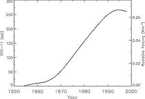 ![]() Figure 12: Global mean CFC-11 (CFCl3) tropospheric abundance (ppt) from 1950 to 1998 based on smoothed measurements and emission models. CFC-11's radiative forcing is shown on the right axis. [Based on Figure 4.6] |