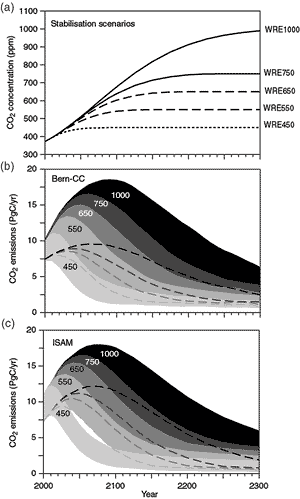 ![]() Figure 25: Projected CO2 emissions permitting stabilisation of atmospheric CO2 concentrations at different final values. Panel (a) shows the assumed trajectories of CO2 concentration (WRE scenarios) and panels (b) and (c) show the implied CO2 emissions, as projected with two fast carbon cycle models, Bern-CC and ISAM. The model ranges for ISAM were obtained by tuning the model to approximate the range of responses to CO2 and climate from model intercomparisons. This approach yields a lower bound on uncertainties in the carbon cycle response. The model ranges for Bern-CC were obtained by combining different bounding assumptions about the behaviour of the CO2 fertilisation effect, the response of heterotrophic respiration to temperature and the turnover time of the ocean, thus approaching an upper bound on uncertainties in the carbon cycle response. For each model, the upper and lower bounds are indicated by the top and bottom of the shaded area. Alternatively, the lower bound (where hidden) is indicated by a hatched line. [Based on Figure 3.13] |