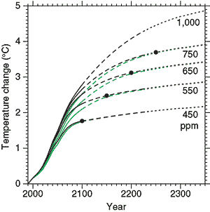 All of the stabilisation profiles studied require CO2 emissions to eventually drop well below current levels. Anthropogenic CO2 emission rates that arrive at stable CO2 concentration levels from 450 to 1,000 ppm were deduced from the prescribed CO2 profiles (Figure 25a). The results (Figure 25b) are not substantially different from those presented in the SAR; however, the range is larger, mainly due to the range of future terrestrial carbon uptake caused by different assumptions in the models. Stabilisation at 450, 650 or 1,000 ppm would require global anthropogenic emissions to drop below 1990 levels within a few decades, about a century, or about two centuries, respectively, and continue to steadily decrease thereafter. Although there is sufficient uptake capacity in the ocean to incorporate 70 to 80% of foreseeable anthropogenic CO2 emissions to the atmosphere, this process takes centuries due to the rate of ocean mixing. As a result, even several centuries after emissions occurred, about a quarter of the increase in concentration caused by these emissions is still present in the atmosphere. To maintain constant CO2 concentration beyond 2300 requires emissions to drop to match the rate of carbon sinks at that time. Natural land and ocean sinks with the capacity to persist for hundreds or thousands of years are small (<0.2 PgC/yr).