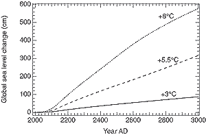 Models project that a local annual average warming of larger than 3°C, sustained for millennia, would lead to virtually a complete melting of the Greenland ice sheet with a resulting sea level rise of about 7 m. Projected temperatures over Greenland are generally greater than globally averaged temperatures by a factor of 1.2 to 3.1 for the range of models used in Chapter 11. For a warming over Greenland of 5.5°C, consistent with mid-range stabilisation scenarios (see Figure 26), the Greenland ice sheet is likely to contribute about 3 m in 1,000 years. For a warming of 8°C, the contribution is about 6 m, the ice sheet being largely eliminated. For smaller warmings, the decay of the ice sheet would be substantially slower (see Figure 27).