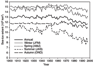 Hemispheric and regional data sets for the Arctic enable the satellite-derived trends in Figure 2.14 to be placed into a century scale context. Figure 2.15 shows annual time-series of the Northern Hemisphere ice extent by season from 1901 to 1999 using in situ data before the satellite era (Vinnikov et al., 1999a). It should be emphasised that the spatial coverage of earlier data is not complete, with the largest data voids in the autumn and winter. Because few data were available, the variability of the autumn and wintertime series in Figure 2.15 is smaller during the early decades of the century. Essentially no data for summer and autumn are available for the World War II period. The summer decrease that is largely responsible for the overall downward trend during the satellite era is present during the entire second half of the 20th century (Figure 2.15). This decrease represents about 15% of the average summer extent in the first half of the 20th century. Spring values show a somewhat weaker negative trend over the same period with a total reduction of near 8%, but there is only a slight and uncertain downward trend in autumn and winter since about 1970.
