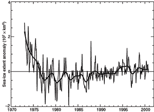 Over the period 1979 to 1996, the Antarctic (Cavalieri et al., 1997; Parkinson et al., 1999) shows a weak increase of 1.3 ± 0.2%/decade. Figure 2.16 (for 1973 to 1998) shows a new integrated data set of Antarctic sea-ice extent that was put together for the new European Centre for Medium-range Weather Forecasts (ECMWF) 40-year reanalysis that extends the record back to 1973. While showing the same weak increase after 1979, it also suggests greater ice extents in the mid-1970s. Although century scale time-series cannot be constructed for the Antarctic, de la Mare (1997) has used whaling ship logs to infer significantly greater ice extent in the Southern Ocean during the 1930s and 1940s than during recent decades. The indirect nature of the earlier evidence, however, introduces substantial uncertainty into this conclusion.