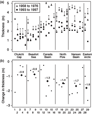 Wadhams and Davis (2000) have compared ice thickness changes between October 1976 and September 1996 between 81°N and 90°N near the 0° meridian. The overall decline in mean sea-ice thickness between 1976 and 1996 was 43%. Over every one degree of latitude, both a significant decline in ice thickness and some completely open water were observed. Despite these dramatic results, it is not known whether these changes reflect long-term change or a major mode of multi-decadal variability. Vinje et al. (1998) measured the thickness of ice exiting the Arctic Ocean through Fram Strait from 1990 to 1996 using moored upward looking sonars and reported a rather different result. The mean annual ice thickness in Fram Strait varied from 2.64 to 3.41 m. These observations were consistent with Arctic Ocean-wide ice thickness estimates made by drilling from Soviet Ice Stations from 1972 to 1981 and from submarine transects from 1960 to 1982, suggesting little change in ice thickness from the 1960s and 1970s to the 1990s.