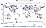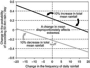 A better understanding of the relationship between changes in total precipitation and intense precipitation events has been achieved since the SAR. Although many areas of the globe have not been analysed, and considerable data remain inaccessible, enough data have been analysed to confirm some basic properties of the changes in extreme precipitation. Groisman et al. (1999) developed a simple statistical model of the frequency of daily precipitation based on the gamma distribution. They applied this model to a variety of regions around the world (40% of the global land area) during the season of greatest precipitation. Although Wilks (1999) shows that the gamma distribution under some circumstances can underestimate the probability of the highest rainfall amounts, Groisman et al. (1999) applied the distribution to the upper 5 and 10 percentiles of the distribution which are less subject to underestimation. Their analysis period varied from region to region, but within each region it generally spanned at least the last several decades, and for some regions much of the 20th century (Australia, United States, Norway, and South Africa). In the model used by Groisman et al. (1999), the mean total precipitation is also proportional to the shape and scale parameters of the gamma distribution as well as to the probability of precipitation on any given day. The shape parameter of the gamma distribution tends to be relatively stable across a wide range of precipitation regimes, in contrast to the scale parameter. Given the conservative nature of the shape parameter, it is possible to illustrate the relationships between changes in the mean total precipitation, the probability of precipitation (which is proportional to the number of days with precipitation), and changes in heavy precipitation (Figure 2.34). Given no change in the frequency (number of days) of precipitation, a 10% change in the mean total precipitation is amplified to a larger percentage change in heavy precipitation rates compared to the change in the mean. Using the statistical theory of extremes, Katz (1999) obtained results consistent with those of Groisman et al. (1999). For many regions of the world it appears that the changes in the frequency or probability of precipitation events are either small enough, or well enough expressed in the high rainfall rates (Karl and Knight, 1998; Gruza et al., 1999; Haylock and Nicholls, 2000) that an increase in the mean total precipitation is disproportionately reflected in increased heavy precipitation rates (Figure 2.35).