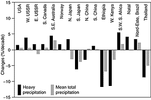 Given the patterns of mean total precipitation changes (Section 2.5.2) during the 20th century, it could be anticipated that, in general, for those areas with increased mean total precipitation, the percentage increase in heavy precipitation rates should be significantly larger, and vice versa for total precipitation decreases. Regional analyses of annual precipitation in the United States (Karl and Knight, 1998; Trenberth, 1998a; Kunkel et al., 1999); Canada (Stone et al., 1999); Switzerland (Frei and Schär, 2001); Japan ( Iwashima and Yamamoto, 1993; Yamamoto and Sakurai, 1999); wintertime precipitation in the UK (Osborn et al., 2000); and rainy season precipitation in Norway, South Africa, the Nord Este of Brazil, and the former USSR (Groisman et al., 1999; Gruza et al., 1999; Easterling et al., 2000) confirm this characteristic of an amplified response for the heavy and extreme events.