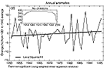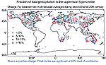 Since large portions of the mid- and high latitude land areas have had increasing precipitation during the last half the 20th century, the question arises as to how much of this area is affected by increases in heavy and extreme precipitation rates. The Frich et al. (2001) analysis suggests an overall increase in the area affected by more intense daily rainfall. Figure 2.36 shows that widely distributed parts of the mid- and high latitudes have locally statistically significant increases in both the proportion of mean annual total precipitation falling into the upper five percentiles and in the annual maximum consecutive 5-day precipitation total. However, for the regions of the globe sampled taken as a whole, only the latter statistic shows a significant increase. Regional analyses in Russia (Gruza et al., 1999), the United States (Karl and Knight, 1998) and elsewhere (Groisman et al., 1999; Easterling et al., 2000) confirm this trend. Although the trends are by no means uniform, as would be anticipated with the relatively high spatial and interannual variability of precipitation, about 10% of the stations analysed show statistically significant increases at the 5% level. This equates to about a 4% increase in the annual maximum 5-day precipitation total (Figure 2.36b). The number of stations reflecting a locally significant increase in the proportion of total annual precipitation occurring in the upper five percentiles of daily precipitation totals outweighs the number of stations with significantly decreasing trends by more than 3 to 1 (Figure 2.36c). Although not statistically significant when averaging over all stations, there is about a 1% increase in the proportion of daily precipitation events occurring in the upper five percentiles (Figure 2.36d). Overall, it is likely that there has been a 2 to 4% increase in the number of heavy precipitation events when averaged across the mid- and high latitudes.