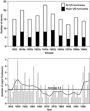 There has been an extensive analysis of the North Atlantic basin for the entire basin back to 1944, and also for the United States landfall tropical storms and hurricanes back to 1899. The all-basin data, however, have been affected by a bias in the measurement of strong hurricanes. This bias has been removed in an approximate way to provide estimates of the true occurrence of intense (or major) hurricanes since 1944 in the North Atlantic (Landsea, 1993). Earlier events lack reliable data on the strong inner core of the hurricanes. The United States record of landfall frequency and intensity of hurricanes is very reliable because of the availability of central pressure measurements at landfall (Jarrell et al., 1992). Both of these data sets continue to show considerable inter-decadal variability, but no significant long-term trends (Figure 2.37, from Landsea et al., 1999). Active years occurred from the late 1940s to the mid-1960s, quiet years occurred from the 1970s to the early 1990s, and then there was a shift again to active conditions from 1995 to 1999. Concurrent with these frequency changes, there have been periods with a strong mean intensity of the North Atlantic tropical cyclones (mid-1940s to the 1960s and 1995 to 1999) and a weak intensity (1970s to early 1990s). There has been no significant change in the peak intensity reached by the strongest hurricane each year (Landsea et al., 1996). As might be anticipated, there is a close correspondence between the intensity of hurricanes in the North Atlantic and those making landfall in the United States (Figure 2.37).