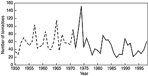 Since 1920, the number of tornadoes reported annually in the United States has increased by an order of magnitude, but this increase reflects greater effectiveness in collecting tornado reports (Doswell and Burgess, 1988; Grazulis, 1993; Grazulis et al., 1998). On the other hand, severe tornadoes are not easily overlooked. Restricting the analysis to very strong and violent tornadoes results in a much different assessment (Figure 2.38) showing little long-term change, though some years like 1974 show a very large number of tornadoes. Furthermore, consideration of the number of days with tornadoes, rather than number of tornadoes, reduces the artificial changes that result from modern, more detailed damage surveys (e.g., Doswell and Burgess, 1988). The data set of “significant” tornado days developed by Grazulis (1993) shows a slow increase in number of days with significant tornadoes from the early 1920s through the 1960s, followed by a decrease since that time.