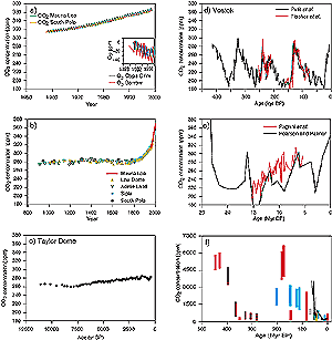 Using time-series and global survey data, the increasing oceanic carbon content has been directly observed, although the signal is small compared to natural variability and requires extremely accurate measurements (Sabine et al., 1997). A long-term increase of surface water CO2 levels tracking the mean atmospheric CO2 increase has been observed in the ocean’s subtropical gyres (Bates et al., 1996; Winn et al., 1998) and the equatorial Pacific (Feely et al., 1999b). However, very few such time-series exist and the response of other important oceanic regions to the atmospheric pCO2 increase cannot yet be assessed. Inter-decadal increases in DIC concentrations at depth have been resolved from direct measurements (Wallace, 1995; Peng et al., 1998; Ono et al., 1998; Sabine et al., 1999). The total amounts of anthropogenic CO2 accumulated in the ocean since the pre-industrial era can also be estimated from measurements using recent refinements (Gruber et al., 1996) of long-standing methods for separating the natural and anthropogenic components of oceanic DIC. A comparison of such analyses with ocean model results is presented in Section 3.6.3.