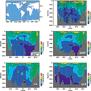 Although regional estimates show discrepancies, modelled estimates of anthropogenic tracers agree reasonably well with observations when integrated globally. The mean value of the penetration depth of bomb 14C for all observational sites during the late 1970s is 390 ± 39 m (Broecker et al., 1995). For the same years and stations, modelled estimates range between 283 and 376 m (Orr et al., 2001). Modelled and observed CFC concentrations have been compared locally but not yet globally (England 1995; Robitaille and Weaver, 1995; Orr and Dutay, 1999). Modelled anthropogenic CO2 inventory since 1800 is comparable to the estimate of 40 ± 9 PgC for the Atlantic Ocean (Gruber, 1998) and 20 ± 3 PgC for the Indian Ocean (Sabine et al., 1999; Orr et al., 2001). Latitude-depth profiles of anthropogenic CO2 in the Atlantic, extracted from data and from models, are shown in Figure 3.9. Modelled CO2 uptake for the global ocean between 1800 and 1990 ranges between 100 and 133 PgC (Figure 3.8), comparable to the preliminary data-based estimate of 107 ± 27 PgC for the global ocean, which includes the Pacific value of 45 ± 15 PgC (Feely et al., 1999a). Although in reasonable agreement with basin and global estimates of anthropogenic CO2, modelled inventories exhibit large differences at the regional scale: models tend to underestimate the inventory of anthropogenic CO2 between 50°S and 50°N in the Atlantic and Indian Oceans, and to overestimate it at high latitudes (Sabine et al., 1999; Orr et al., 2001). In the Southern Ocean the uptake of anthropogenic CO2 varies by a factor of two among models (Orr et al., 2001). The difficulty for models in reproducing the spatial structure of anthropogenic tracers may be indicative of problems in ocean physics mentioned earlier, and may be responsible for the increasing range of model estimates when future CO2 uptake is projected by the same models (Figure 3.10c).
