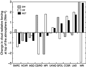 Over the last 10 years, the generalised availability of satellite retrievals (OLR, water path, cloud cover, cloud top temperature) has strongly increased the possibility of assessing clouds simulated by climate models, in spite of remaining uncertainties concerning the vertical structure of the cloud systems, of large importance for all feedback effects. Yet this remains a very difficult task, which may be illustrated by a few figures. Recent simulations of equilibrium climate with a doubling of CO2 indicate that the induced variation of net cloud radiative forcing short-wave or long-wave, ranges within ±3 Wm-2, which is a small fraction of the cloud mean long-wave warming (30 to 35 Wm-2) or cloud mean short-wave cooling (45 to 50 Wm-2) (Le Treut and McAvaney, 2000; Figure 7.2). Although most models simulate CRF values within the uncertainty range of the observed values, the discrepancy in terms of response to CO2 increase is large, both in sign, amplitude, and share between long-wave and short-wave. This disagreement (amplified by the water vapour feedback) reflects the sensitivity of the simulated feedbacks to model formulation (Watterson et al., 1999; Yao and Del Genio, 1999; Meleshko et al., 2000) and is the cause of the large spread in model climate sensitivity (see Figure 7.3; and Chapters 8 and 9). The correct simulation of the mean distribution of cloud cover and radiative fluxes is therefore a necessary but by no means sufficient test of a model’s ability to handle realistically the cloud feedback processes relevant for climate change.