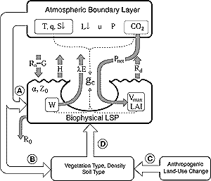 At present, only limited global data sets for LSPs are available and these need to be further improved. A comprehensive land-use/land cover data set, providing a global time-series of vegetation and soil parameters over the last two centuries at GCM resolution, would be a very useful tool to separate land-use change impacts on regional climate from global scale warming effects. Additionally, for both historical analyses and future projections, there is a need for interactive vegetation models that can simulate changes in vegetation parameters and carbon cycle variables in response to climate change. These proposed fourth generation models are just beginning to be designed and implemented within climate models.