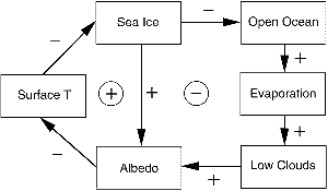 Sea ice plays an important role in moderating heat exchange between the ocean and atmosphere at high latitudes, especially by controlling the heat flux through openings in the ice. Sea ice also interacts with the broader climate system via the ice albedo feedback, which amplifies projected climate warming at high latitudes, and by oceanic feedbacks involving ice growth and melt and the fresh water balance at the ocean surface (Curry and Webster, 1999; Lewis, 2000) Two feedbacks associated with sea ice are illustrated in Figure 7.6.