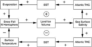 Ice stream instability, ice shelf break-up and switches in routing and discharge of glacial melt water present themselves as mechanisms for altering the surface salinity of oceans and inducing changes in the pattern and strength of the THC. There are positive and negative feedbacks associated with changing land ice masses (Figure 7.7). In coupled climate models, all these cryospheric processes are represented simply as surface fresh water inputs to the ocean (see Chapter 8, Section 8.5.4.2).