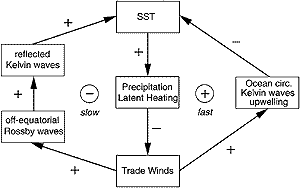 ENSO is generated by ocean-atmosphere interactions internal to the tropical Pacific and overlying atmosphere. Positive temperature anomalies in the eastern equatorial Pacific (characteristic of an El Niño event) reduce the normally large sea surface temperature difference across the tropical Pacific. As a consequence, the trade winds weaken, the Southern Oscillation index (defined as the sea level pressure difference between Tahiti and Darwin) becomes anomalously negative, and sea level falls in the west and rises in the east by as much as 25 cm as warm waters extend eastward along the equator. At the same time, these weakened trades reduce the upwelling of cold water in the eastern equatorial Pacific, thereby strengthening the initial positive temperature anomaly. The weakened trades also cause negative off-equatorial thermocline depth anomalies in the central and western Pacific. These anomalies propagate westward to Indonesia, where they are reflected and propagate eastward along the equator. Thus some time after their generation, these negative anomalies cause the temperature anomaly in the east to decrease and change sign. The combination of the tropical air-sea instability and the delayed negative feedback due to sub-surface ocean dynamics can give rise to oscillations (for a summary of theories see Neelin et al., 1998). Two of these feedbacks are schematically illustrated in Figure 7.8. Beyond influencing tropical climate, ENSO seems to have a global influence: during and following El Niño, the global mean surface temperature increases as the ocean transfers heat to the atmosphere (Sun and Trenberth, 1998).