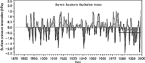 Indices of ENSO for the past 120 years (Figure 7.9), indicate that there is considerable variability in the ENSO cycle in the modern record. This variability has been variously attributed to: (i) stochastic forcing due to weather and other high-frequency “noise”, and the Madden-Julian intra-seasonal oscillation in particular; (ii) deterministic chaos arising from internal non-linearities of the tropical Pacific ENSO system; (iii) forcing within the climate system but external to the tropical Pacific, and (iv) changes in exogenous forcing (see Neelin et al., 1998 and references therein). Palaeo-proxies, archaeological evidence, and instrumental data (see Chapter 2) all indicate variations in ENSO behaviour over the past centuries, and throughout the Holocene. Much of this variability appears to be internal to the Earth’s climate system, but there is evidence that the rather weak forcing due to orbital variations may be responsible for a systematic change to weaker ENSO cycles in the mid-Holocene (Sandweiss et al., 1996; Clement et al., 1999; Rodbell et al., 1999). However, it appears that the character of ENSO can change on a much faster time-scale than that of small amplitude insolation change imposed by the Earth’s varying orbit. The inference to be drawn from observed ENSO variability is that small forcings are able to cause large alterations in the behaviour of this non-linear system.