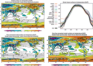 In Figures 8.5 and 8.6, models are divided into flux adjusted and non-flux adjusted classes. Slight differences between the two may be discerned, but it is not obvious that these are statistically significant if the two classes are considered as random samples from a large population of potential climate models. The same conclusion was reached in a detailed study of the seasonal cycle of surface air temperature in the CMIP models (Covey et al., 2000a). (That study, however, also noted that many of the non-flux adjusted models suffered from unrealistic “climate drift” up to about 1°C / century in global mean surface temperature.) The relatively small differences between flux adjusted and non-flux adjusted models noted above suggest that flux adjustments could be - indeed, are being - dispensed with at acceptable cost in many climate models, at least for the century time-scale integrations of interest in detecting and predicting anthropogenic climate change. In recent models that omit flux adjustment, the representation of atmospheric fields has in some cases actually improved, compared with older, flux-adjusted versions of the models. Examples include the HadCM3 model and the CSM 1.0 model. In CSM 1.0, atmospheric temperature, precipitation and atmospheric circulation are close to values simulated when the atmospheric component of the CSM 1.0 model is driven by observed sea surface temperatures (Boville and Hurrell, 1998).