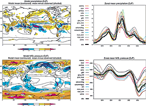 Figures 8.2 and 8.3 (reproduced from Lambert and Boer, 2001) update this assessment using coupled model output from the CMIP1 database. For each quantity, the figures show both a map of the average over all fifteen models (“model mean”) and zonal means for all individual fifteen models. Lambert and Boer (2001) demonstrate that the model mean exhibits good agreement with observations, often better than any of the individual models. Inspection of these portions of the figures reaffirms the SAR conclusions summarised above. The errors in model-mean surface air temperature rarely exceed 1°C over the oceans and 5°C over the continents; precipitation and sea level pressure errors are relatively greater but the magnitudes and patterns of these quantities are recognisably similar to observations. The bottom portion of Figure 8.2 shows maps of the model mean taken separately over all flux adjusted models (lower left) and all non-flux adjusted models (lower right). Flux adjusted models are generally more similar to the observations - and to each other - than are non-flux adjusted models. However, errors in the non-flux adjusted model mean are not grossly larger than errors in the flux adjusted model mean (except in polar regions). This result from the “inter-model” CMIP database suggests that the SAR was correct in anticipating that the need for flux adjustments would diminish as coupled models improve. It is reinforced by “intra-model ensembles”, i.e., by the experience that improvements to individual models can reduce the need for flux adjustments (e.g., Boville and Gent, 1998).
