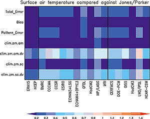 Figures 8.5 and 8.6 show global mean errors (“bias”) and root mean square (r.m.s.) errors normalised by standard deviations for surface air temperature and precipitation in CMIP2 model simulations. Both the r.m.s. errors and the background standard deviations are calculated from the full spatial and temporal variability of the fields. The r.m.s. errors are divided into a number of components such as zonal mean vs. deviations and annual mean vs. seasonal cycle. For nearly all models the r.m.s. error in zonal- and annual-mean surface air temperature is small compared with its natural variability. The errors in the other components of surface air temperature, and in zonal mean precipitation, are relatively larger but generally not excessive compared with natural variability.