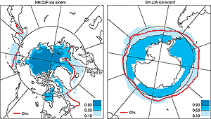 Figure 8.10 provides a visual presentation of the range in simulated ice extent, and was constructed as follows. For each model listed in Table 8.3, a 1/0 mask was produced to indicate presence or absence of ice. The fifteen masks were averaged for each hemisphere and season and the percentage of models that had sea ice at each grid point was calculated.