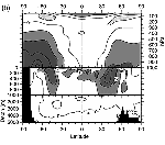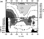 Figure 8.9: Zonal mean air and sea temperature “errors” in °C (defined here as the difference from the initial model state, which was derived from observations), for three different coupled models. The models are all versions of the ARPEGE/OPA model, with T31 atmospheric resolution, and differ only in the parametrization of lateral mixing used in the ocean component ((a) lateral diffusion, (b) isopycnal diffusion, (c) the scheme of Gent and McWilliams (1990)). The different mixing schemes produce different rates of heat transport between middle and high latitudes, especially in the Southern Hemisphere. The atmosphere must adjust in order to radiate the correct amount of heat to space at high latitudes (Chapter 7, Section 7.6 and Section 8.4.1), and this adjustment results in temperature differences at all levels of the atmosphere. From Guilyardi (1997). |