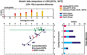 An alternative approach to evaluating climate sensitivity is provided by the detailed comparison of model results with proxy-data over different regions. The amplitude of the tropical cooling at LGM has long been disputed (Rind and Peteet, 1985; Guilderson et al., 1994). Compared to a new synthesis of terrestrial data (Farrera et al., 1999), PMIP simulations with prescribed CLIMAP sea-surface conditions produce land temperatures that are too warm (Pinot et al., 1999) (Figure 8.14), which may be due to too-warm prescribed SSTs, as indicated by new marine data based on alkenone palaeo-thermometry (Rosell-Melé et al., 1998) (Figure 8.14). Some mixed-layer ocean models have produced more realistic sea and land temperature cooling (Pinot et al., 1999), enhancing our confidence in using such models to estimate climate sensitivity (see Chapter 9, Section 9.3.4) (Figure 8.14). The same conclusion is derived by Broccoli (2000) when accounting for uncertainties in both the forcing and reconstructed climate from various proxy data. Over Eurasia, all the models simulate a cooling in fairly good agreement with proxy data estimates, except over western Europe (Kageyama et al., 2001), where they all underestimate the winter cooling shown from pollen data (Peyron et al., 1998). However, such simulations have an important caveat since they prescribe present day ocean heat transport whereas changes in the North Atlantic deep water circulation shown by two EMIC models (Ganopolski et al., 1998b; Weaver et al., 1998) and also inferred by palaeo-oceanographic data (e.g., Duplessy et al., 1988) may further decrease temperatures over Europe.