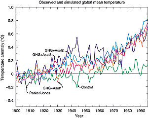 Coupled models that have been used to simulate changes over the 20th century have all started with “control model” levels of atmospheric CO2 (typically 330 ppm). This initial condition is then referred to as the “pre-industrial” initial condition. Changes in radiative forcing are then calculated by taking the observed atmospheric equivalent CO2 level over the 20th century as a difference relative to the actual pre-industrial level (280 ppm), and adding this as a perturbation to the control model levels. Implicit in this approach is the assumption that the climate system responds linearly to small perturbations away from the present climate. Haywood et al. (1997) demonstrated the near linear response of the GFDL-coupled model to changes in radiative forcing associated with increases in atmospheric greenhouse gases and sulphate aerosols. When added together, experiments which included aerosol and greenhouse gas increases separately over the 20th century yielded a similar transient response (in terms of globally averaged and geographical distribution of surface air temperature and precipitation) to an experiment which included both aerosol and greenhouse gas increases. This analysis is particularly important as it validates the methodological approach used in coupled model simulations of the 20th century climate.