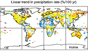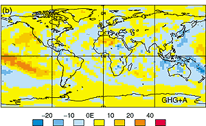 As noted in the SAR, the inclusion of the direct effect of sulphate aerosols is important since the radiative forcing associated with 20th century greenhouse gas increase alone tends to overestimate the 20th century warming in most models. Groups that have included a representation of the direct effects of sulphate aerosols have found that their model generally reproduces the observed trend in the instrumental surface air temperature warming, thereby suggesting that their combination of model climate sensitivity and oceanic heat uptake is not unrealistic (see Chapter 9, Section 9.2.1 and Figure 9.7). These same models have more difficulty representing variability observed within the 20th century instrumental record (Sections 8.6.2, 8.6.3). As mentioned in Section 8.6.3, some modelling studies suggest that the inclusion of additional forcings from solar variability and volcanic aerosols may improve aspects of this simulated variability. Delworth and Knutson (2000), on the other hand, note that one of their six 20th century integrations (using GFDL_R30_c) bears a striking resemblance to the observed 20th century warming which occurs primarily in two distinct periods (from 1925 to 1944 and from 1978 to the present), without the need for additional external forcing. In addition, all coupled models have shown a trend towards increasing global precipitation, with an intensification of the signal at the high northern latitudes, consistent with the observational record (Figure 8.16). Nevertheless, AOGCM simulations have yet to be systematically analysed for the occurrence of other key observed trends, such as the reduction in diurnal temperature range over the 20th century and the associated increase in cloud coverage.