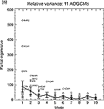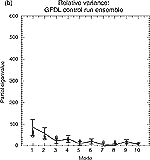 Barnett (1999) concatenated the annual mean near-surface temperature anomaly fields from the first 100 years of integration of eleven CMIP control experiments to produce common empirical orthogonal functions (EOFs) for the eleven AOGCMs. By projecting the Global Sea Ice and Sea Surface Temperature (GISST) annual mean temperature anomaly data set (Rayner et al. 1996) onto these common EOFs, he was able to estimate to what extent model variability represented the observed variability. An analysis of the partial eigenvalue spectrum for the different models (Figure 8.17a) suggests that there is considerable disparity between the estimates of variability within the coupled models. Some of this disparity arises from model drift and other low-frequency variability. Intra-model disparity was much lower than inter-model disparity as demonstrated by a similar common EOF analysis obtained from ten 100 year segments in the 1,000 year GFDL_R15_a control run (Figure 8.17b). While the highest two modes were substantially underestimated in the GFDL_R15_a model, the higher modes agreed better with observations. Error bars on the observational data are large and when this is taken into account, model disagreement with observations may not be significant. As Barnett (1999) did not remove the trend over the 20th century in the GISST data set, the observations also contain responses to both natural and anthropogenic forcing. One would therefore expect control integrations from coupled climate models to underestimate the observed spectrum at low frequencies (e.g., Folland et al., 1999).