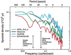 There have been relatively few studies which have undertaken a systematic comparison of AOGCM variability with variability found in the Holocene proxy temperature record. However, three studies (from the MPI (Max Planck Institute), Hadley Centre and GFDL) that focus on the analysis of long control integrations are available. Barnett et al. (1996) demonstrated that the GFDL_R15_a (Stouffer et al., 1994) and ECHAM1/LSG (Cubasch et al., 1994) models underestimate the levels of decadal-scale variability in summer palaeo-temperature proxies from 1600 to 1950 (expanded version of Bradley and Jones, 1993), with increasing disparity with observations at lower frequencies.