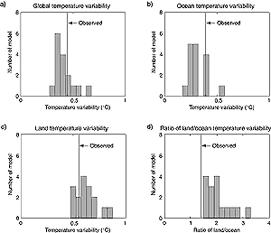 As an extension to the above analysis, Bell et al. (2000) compared annual mean surface air temperature variability in sixteen CMIP control simulations to the thermometer record, on time-scales of 1 year to 40 years (Figure 8.19). The authors found that: (1) thirteen of the sixteen CMIP models underestimate variability in surface air temperatures over the global oceans; (2) twelve of the sixteen models overestimate variability over land; (3) all the models overestimate the ratio of air temperature variability over land to variability over oceans. These results likely reflect problems in both the ocean and land-surface components of climate models. In particular, underestimation of variability over oceans may be due, at least in part, to weak or absent representations of El Niño in the models; overestimation of variability over land may be due to poor land surface parametrizations including insufficient soil moisture.