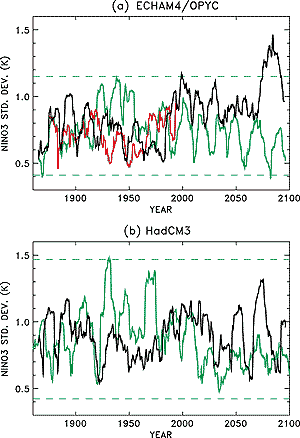 Secondly, will El Niño variability (the amplitude and/or the frequency of temperature swings in the equatorial Pacific) increase or decrease? Attempts to address this question using climate models have again shown conflicting results, varying from slight decreases or little change in amplitude (Tett 1995; Knutson et al., 1997; Noda et al., 1999b; Collins, 2000b; Washington et al., 2001; Figure 9.26b) to a small increase in amplitude (Timmermann et al., 1999; Collins, 2000a; Figure 9.26a), which has been attributed to an increase in the intensity of the thermocline in the tropical Pacific. Knutson et al. (1997) and Hu et al. (2001) find that the largest changes in the amplitude of ENSO occur on decadal time-scales with increased multi-decadal modulation of the ENSO amplitude. Several authors have also found changes in other statistics of variability related to ENSO. Timmermann et al. (1999) find that the interannual variability of their model becomes more skewed towards strong cold (La Niña type) events relative to the warmer mean climate. Collins (2000a) finds an increased frequency of ENSO events and a shift in the seasonal cycle, so that the maximum occurs between August and October rather than around January as in the unperturbed model and the observations. Some recent coupled models have achieved a stable climate without the use of flux adjustments and an important question to ask is what is the effect of flux adjustment on changes in variability. Collins (2000b) finds different responses in ENSO in two models, one of which has been run without the use of flux-adjustments. However, he concludes that differences in response are most likely to be due to differences in the response of the meridional temperature gradient in the two models arising from different cloud feedbacks (Williams et al., 2001) rather than due to the presence or absence of flux adjustment.
