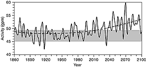 The reasons given for this common result are still under discussion. Carnell and Senior (1998) ascribe it to a decrease in the mean meridional temperature gradient in the future climate, with high latitudes warming more than low latitudes (producing fewer storms), and greater latent heating in the moister atmosphere (resulting in deeper lows). Sinclair and Watterson (1999) point to the reduced mean sea level pressure and emphasise that vorticity as a measure of cyclone strength does not increase. Knippertz et al.(2000) consider the increasing upper tropospheric baroclinicity to be an important indicator of the change in surface cyclone activity. They also detect an increasing number of strong wind events in their simulation that can be assigned to the increasing number of deep lows. Upper air storm track activity (defined as the standard deviation of the band pass filtered 500 hPa height and related to the surface lows) has been found to increase over the East Atlantic and Western Europe with rising greenhouse gas forcing (such as seen in Figure 9.30 from Ulbrich and Christoph, 1999).