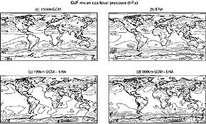 The repositioning of the storm tracks generally improves the simulations in the Northern Hemisphere, as it reduces a positive polar surface pressure bias which is present in the models at standard resolution. In the case of HadAM3a, this leads to substantial improvements in Northern Hemisphere low level flow in winter (Figure 10.8). In the Southern Hemisphere, the impact on the circumpolar flow is not consistently positive across models (Figure 10.8; Krinner et al., 1997). In ECHAM4 and HadAM3a, increased resolution has little impact on the negative surface pressure bias over the tropics but improves the low-level South Asian monsoon flow (Lal et al., 1997; Stratton, 1999b).