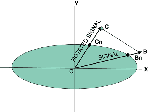 Suppose for simplicity that most of the natural variability can be described in terms of two modes (well-defined spatial patterns) of variability. In the absence of climate change, the amplitudes of these two modes, plotted on a 2D diagram along OX and OY will vary with time, and for a given fraction of occasions (usually chosen as 95%), the amplitude of each mode will lie within the shaded ellipse. Suppose we are attempting to detect a fingerprint that can be made up of a linear combination of the two patterns such that it lies along OB. The signal to noise ratio is given by OB/OBn. Because our signal lies close to the direction of the main component of variability, the signal to noise ratio is small. On the other hand, we can choose a direction OC that overlaps less with the main component of natural variability such that the signal to noise ratio OC/OCn for the component of the signal that lies in direction OC is larger even though the projected signal OC is smaller then the full signal OB. Optimal detection techniques merely choose the direction OC that maximises the signal to noise ratio. This is equivalent to general linear regression (see Appendix 12.1). A good estimate of natural internal variability is required to optimise effectively. |